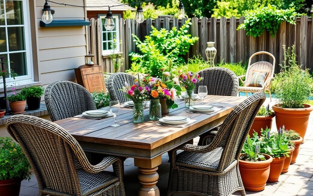 For seating, pick materials that last through weather. Wicker, teak, and recycled plastic are good choices. Vintage pieces can also add character to your space.