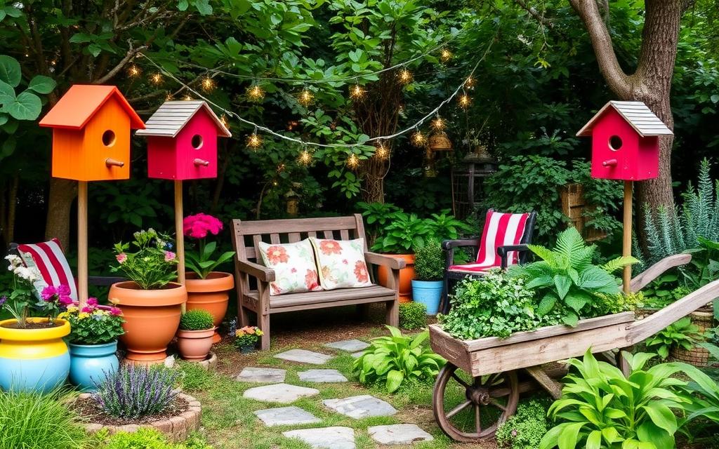 Adding these elements makes your garden warm and welcoming. Make sure your DIY decor and rustic furniture work well together. This way, your outdoor space will be both beautiful and practical.
